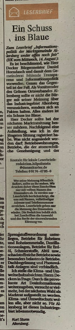 Da ich 43 Jahre in einem umweltschützenden Betrieb gearbeitet habe, und mich die Komunalpolitik Allersberg sehr interessiert, stelle ich Ihre Klima- und Umweltschutzabsichten in Frage. Durch Ihre provokante Art, Desinformationen weiterzugeben, versuchen Sie vielmehr, bei der nächsten Wahl als Marktrat aufgestellt zu werden.